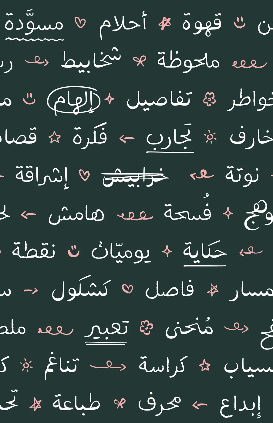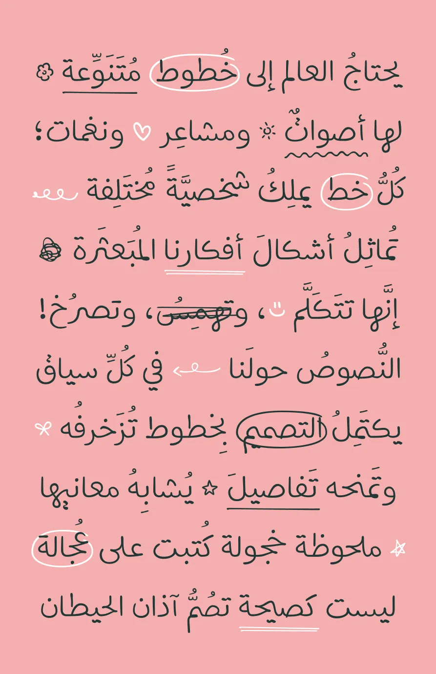خطٌّ به شيءٌ من العفويَّة *زهرة* وأُلفة الكِتابة اليدويَّة ~-~ مِثل خطِّ زميلٍ في الفصل *قلب* أو خربشات== سريعةٍ على هامِش دفترٍ قديم؛ بعيدٌ عن الإتقانِ الميكانيكيِّ###، ويحتفِظُ ببعضٍ من الفَوضى~~~ ## اليدويَّة الجميلة *شمس*
